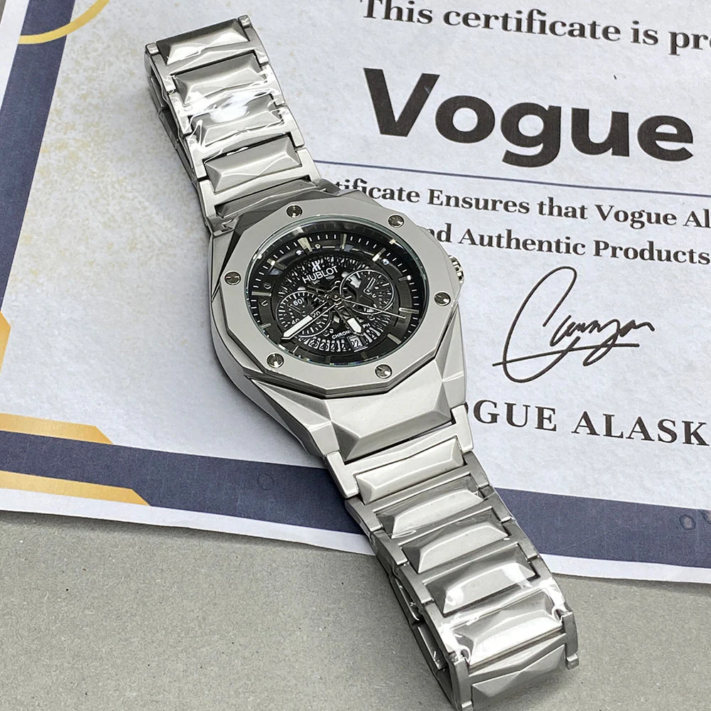 Inspired by the elite Hublot aesthetic, this cut-skeleton dial watch is a head-turner for any man who values style and presence. With a bold black finish, skeleton display, and industrial edge, this wristwatch is built to impress.
